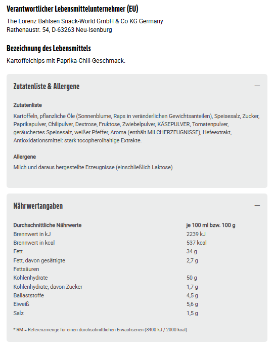 Zutaten: Kartoffeln, pflanzliche Öle (Sonnenblume, Raps in veränderlichen Gewichtsanteilen), Speisesalz, Zucker, Paprikapulver, Chilipulver, Dextrose, Fruktose, Zwiebelpulver, KÄSEPULVER, Tomatenpulver, geräuchertes Speisesalz, weißer Pfeffer, Aroma (enthält MILCHERZEUGNISSE), Hefeextrakt, Antioxidationsmittel: stark tocopherolhaltige Extrakte.