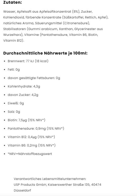 Wasser, Apfelsaft aus Apfelsaftkonzentrat (8%), Zucker, Kohlendioxid, färbende Konzentrate (Süßkartoffel, Rettich, Apfel), natürliches Aroma, Säuerungsmittel (Citronensäure), Stabilisatoren (Gummi arabicum, Xanthan, Glycerinester aus Wurzelharz), Vitamine (Pantothensäure, Vitamin B6, Biotin, Vitamin B12).