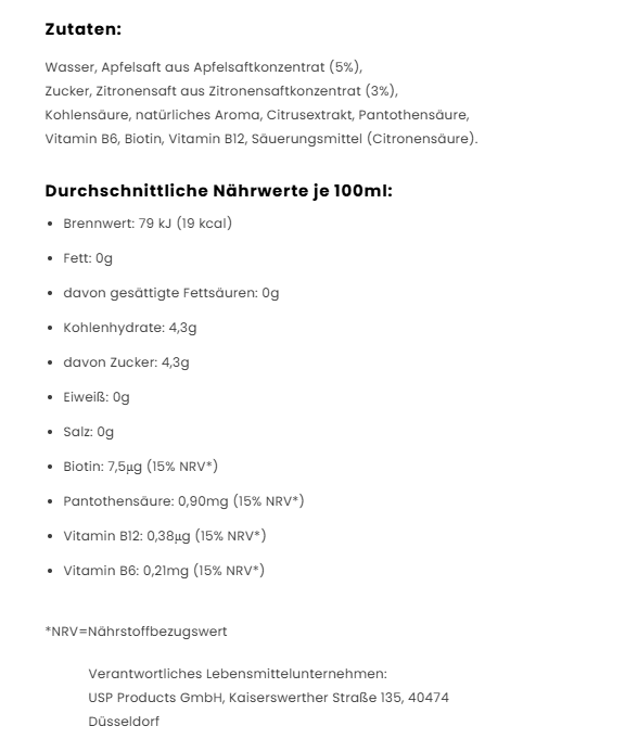 Zucker, Zitronensaft aus Zitronensaftkonzentrat (3%), Kohlensäure, natürliches Aroma, Citrusextrakt, Pantothensäure, Vitamin B6, Biotin, Vitamin B12, Säuerungsmittel (Citronensäure).