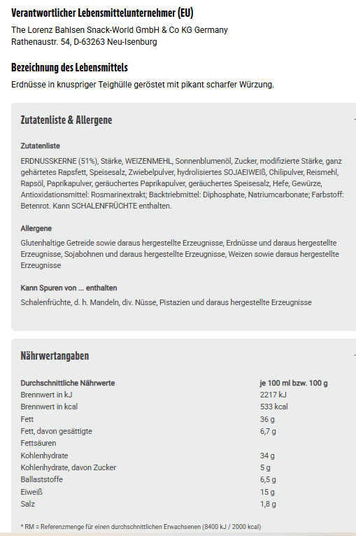 Zutaten: ERDNUSSKERNE (51%), Stärke, WEIZENMEHL, Sonnenblumenöl, Zucker, modifizierte Stärke, ganz gehärtetes Rapsfett, Speisesalz, Zwiebelpulver, hydrolisiertes SOJAEIWEIß, Chilipulver, Reismehl, Rapsöl, Paprikapulver, geräuchertes Paprikapulver, geräuchertes Speisesalz, Hefe, Gewürze, Antioxidationsmittel: Rosmarinextrakt; Backtriebmittel: Diphosphate, Natriumcarbonate; Farbstoff: Betenrot. Kann SCHALENFRÜCHTE enthalten.