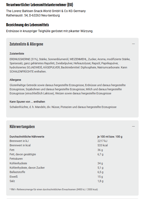 Zutaten: ERDNUSSKERNE (51%), Stärke, Sonnenblumenöl, WEIZENMEHL, Zucker, Aroma, modifizierte Stärke, Speisesalz, ganz gehärtetes Rapsfett, Zwiebelpulver, Hefeautolysat, Rapsöl, Paprikapulver, hydrolisiertes SOJAEIWEIß, KÄSEPULVER, Backtriebmittel: Diphosphate, Natriumcarbonate. Kann SCHALENFRÜCHTE enthalten.