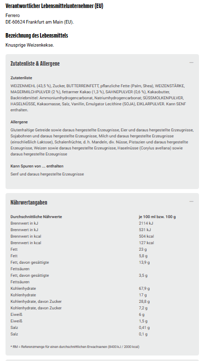 WEIZENMEHL (43,5 %), Zucker, BUTTERREINFETT, pflanzliche Fette (Palm, Shea), WEIZENSTÄRKE, MAGERMILCHPULVER (2 %), fettarmer Kakao (1,3 %), SAHNEPULVER (0,6 %), Kakaobutter, Backtriebmittel: Ammoniumhydrogencarbonat, Natriumhydrogencarbonat; SÜSSMOLKENPULVER, HASELNÜSSE, Kakaomasse, Salz, Vanillin, Emulgator Lecithine (SOJA), EIKLARPULVER. Kann SENF enthalten.