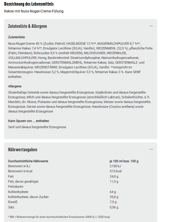 Zutaten: Nuss-Nugat-Creme 40 % (Zucker, Palmöl, HASELNÜSSE 13 %**, MAGERMILCHPULVER 8,7 %**, fettarmer Kakao 7,4 %**, Emulgator Lecithine (SOJA), Vanillin), WEIZENMEHL (32,5 %), pflanzliche Fette (Palm, Palmkern), Rohrzucker 8,5 % (enthält WEIZEN), MILCHZUCKER, WEIZENKLEIE, VOLLMILCHPULVER, Honig, Backtriebmittel: Dinatriumdiphosphat, Natriumhydrogencarbonat, Ammoniumhydrogencarbonat; GERSTENMALZMEHL, fettarmer Kakao, Salz, GERSTENMALZ- und Maisextraktpulver, WEIZENSTÄRKE, Emulgator Lecithine (SOJA), Vanillin. **entspricht im Gesamterzeugnis: Haselnüsse 5,2 %, Magermilchpulver 3,5 %, fettarmer Kakao 3 %. Kann SENF enthalten.