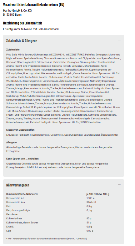 Pico Balla Minis Zucker; Glukosesirup; WEIZENMEHL; WEIZENSTÄRKE; Palmfett; Emulgator: Mono- und Diglyceride von Speisefettsäuren, Citronensäureester von Mono- und Diglyceriden von Speisefettsäuren; Dextrose; Säuerungsmittel: Citronensäure; Geliermittel: Carrageen; Säureregulator: Trinatriumcitrat; Aroma; Frucht- und Pflanzenkonzentrate: Spirulina, Rettich, Schwarze Johannisbeere, Apfel, Holunderbeere, Aronia, Traube; Holunderbeerextrakt; Farbstoffe: Kurkumin, Kupferkomplexe der Chlorophylline; Überzugsmittel: Bienenwachs weiß und gelb, Carnaubawachs. Kann Spuren von MILCH enthalten. Pasta Frutta Minis Zutaten: Glukosesirup; Zucker; Stärke; Feuchthaltemittel: Sorbitsirup; WEIZENMEHL; Säuerungsmittel: Citronensäure, Äpfelsäure; Säureregulator: Natriumhydrogenmalat; Aroma; Frucht- und Pflanzenkonzentrate: Saflor, Holunderbeere, Schwarze Johannisbeere, Orange, Zitrone, Mango, Passionsfrucht, Aronia, Traube; Holunderbeerextrakt; Farbstoff: Indigotin. Kann Spuren von MILCH enthalten. S´Ghetti Minis Zutaten: Zucker; Glukosesirup; Stärke; Feuchthaltemittel: Sorbitsirup; WEIZENMEHL; Säuerungsmittel: Citronensäure, Äpfelsäure; Säureregulator: Natriumhydrogenmalat; Aroma; Frucht- und Pflanzenkonzentrate: Saflor, Holunderbeere, Orange, Schwarze Johannisbeere, Zitrone, Mango, Passionsfrucht, Aronia, Traube; Holunderbeerextrakt; Karamellsirup; Farbstoff: Kupferkomplexe der Chlorophylline. Kann Spuren von MILCH enthalten. Bunte Tüte Minis Zutaten: Glukosesirup; Zucker; Stärke; Säuerungsmittel: Citronensäure; Karamellsirup; Frucht- und Pflanzenkonzentrate: Saflor, Spirulina, Orange, Holunderbeere, Schwarze Johannisbeere, Zitrone, Aronia, Traube; Aroma; Überzugsmittel: Bienenwachs weiß und gelb, Carnaubawachs; Holunderbeerextrakt; Farbstoff: Indigotin. Kann Spuren von MILCH, WEIZEN enthalten.