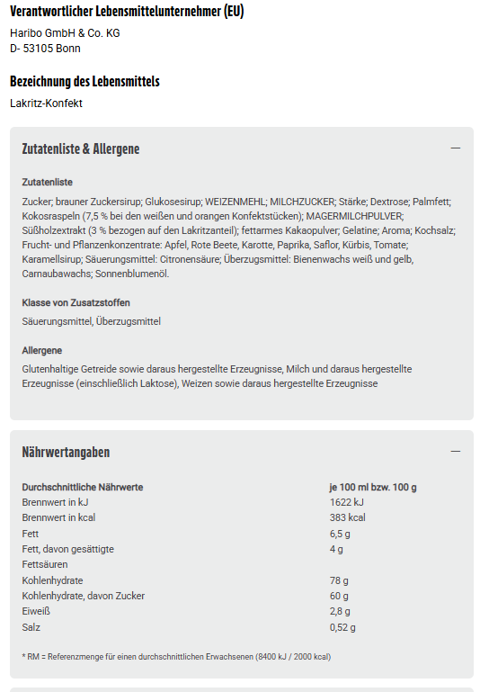 Zucker; brauner Zuckersirup; Glukosesirup; WEIZENMEHL; MILCHZUCKER; Stärke; Dextrose; Palmfett; Kokosraspeln (7,5 % bei den weißen und orangen Konfektstücken); MAGERMILCHPULVER; Süßholzextrakt (3 % bezogen auf den Lakritzanteil); fettarmes Kakaopulver; Gelatine; Aroma; Kochsalz; Frucht- und Pflanzenkonzentrate: Apfel, Rote Beete, Karotte, Paprika, Saflor, Kürbis, Tomate; Karamellsirup; Überzugsmittel: Bienenwachs weiß und gelb, Carnaubawachs; Säuerungsmittel: Citronensäure.
