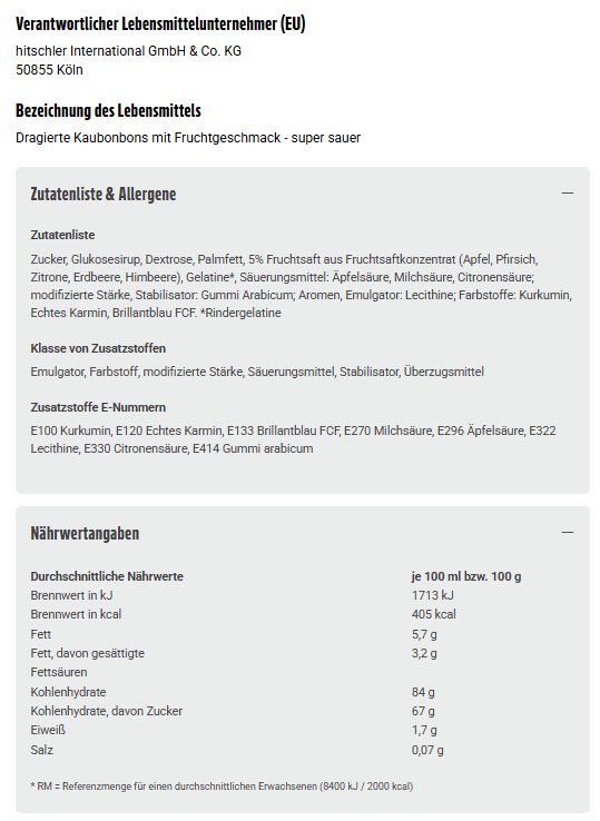 Zucker, Glukosesirup, Dextrose, Palmfett, 5% Fruchtsaft aus Fruchtsaftkonzentrat (Apfel, Pfirsich, Zitrone, Erdbeere, Himbeere), Gelatine*, Säuerungsmittel: Äpfelsäure, Milchsäure, Citronensäure; modifizierte Stärke, Stabilisator: Gummi Arabicum; Aromen, Emulgator: Lecithine; Farbstoffe: Kurkumin, Echtes Karmin, Brillantblau FCF. *Rindergelatine