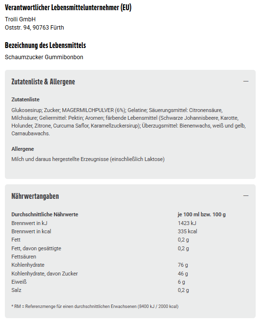 Glukosesirup; Zucker; MAGERMILCHPULVER (6%); Gelatine; Säuerungsmittel: Citronensäure, Milchsäure; Geliermittel: Pektin; Aromen; färbende Lebensmittel (Schwarze Johannisbeere, Karotte, Holunder, Zitrone, Curcuma Saflor, Karamellzuckersirup); Überzugsmittel: Bienenwachs, weiß und gelb, Carnaubawachs.