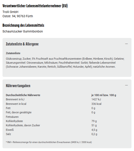 Glukosesirup; Zucker; 5% Fruchtsaft aus Fruchtsaftkonzentraten (Erdbeer, Himbeer, Kirsch); Gelatine; Säuerungsmittel: Citronensäure, Milchsäure; Feuchthaltemittel: Sorbit; färbende Lebensmittel (Schwarze Johannisbeere, Karotte, Rettich, Süßkartoffel, Holunder, Apfel); natürliche Aromen.