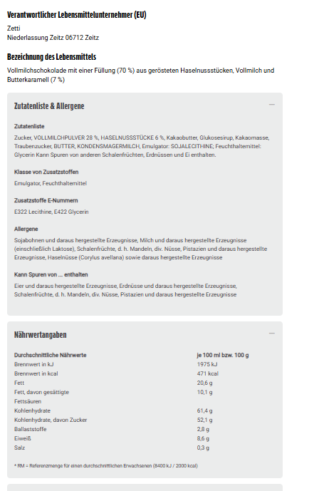 Vollmilchschokolade mit einer Füllung (70 %) aus gerösteten Haselnussstücken, Vollmilch und Butterkaramell (7 %)