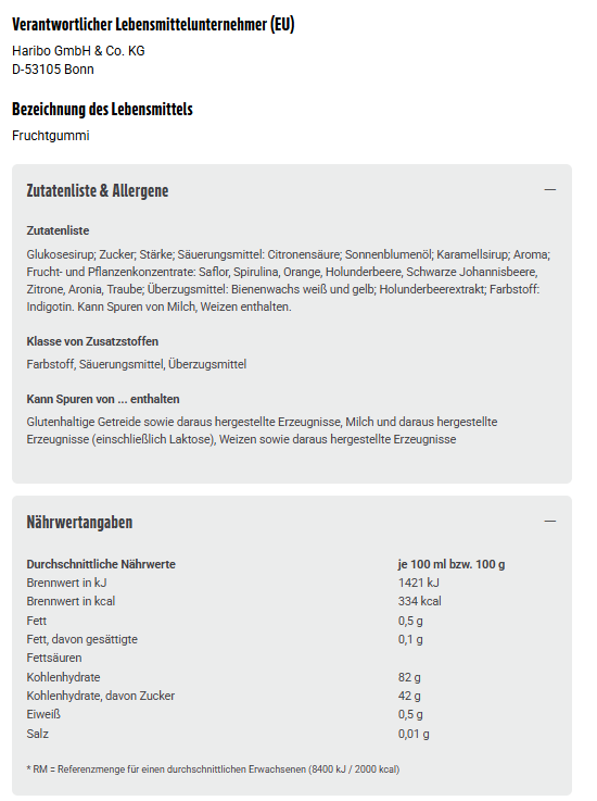 Glukosesirup; Zucker; Stärke; Säuerungsmittel: Citronensäure; Sonnenblumenöl; Karamellsirup; Aroma; Frucht- und Pflanzenkonzentrate: Saflor, Spirulina, Orange, Holunderbeere, Schwarze Johannisbeere, Zitrone, Aronia, Traube; Überzugsmittel: Bienenwachs weiß und gelb; Holunderbeerextrakt; Farbstoff: Indigotin. Kann Spuren von Milch, Weizen enthalten.