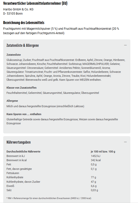 Glukosesirup; Zucker; Fruchtsaft aus Fruchtsaftkonzentrat: Erdbeere, Apfel, Zitrone, Orange, Himbeere, Schwarze Johannisbeere, Kirsche; Feuchthaltemittel: Sorbitsirup; MAGERMILCHPULVER; Gelatine; Säuerungsmittel: Citronensäure; Geliermittel: Amidiertes Pektin; Sonnenblumenöl; Aroma; Säureregulator: Trinatriumcitrat; Frucht- und Pflanzenkonzentrate: Saflor, Holunderbeere, Schwarze Johannisbeere, Spirulina, Apfel, Orange, Aronia, Zitrone, Traube, Kiwi; Holunderbeerextrakt; Überzugsmittel: Bienenwachs weiß und gelb. Kann Spuren von WEIZEN enthalten.