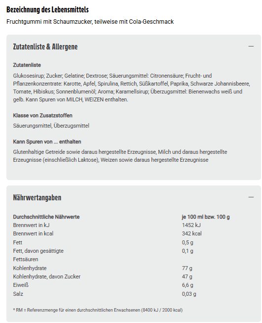 Glukosesirup; Zucker; Gelatine; Dextrose; Säuerungsmittel: Citronensäure; Frucht- und Pflanzenkonzentrate: Karotte, Apfel, Spirulina, Rettich, Süßkartoffel, Paprika, Schwarze Johannisbeere, Tomate, Hibiskus; Sonnenblumenöl; Aroma; Karamellsirup; Überzugsmittel: Bienenwachs weiß und gelb. Kann Spuren von MILCH, WEIZEN enthalten.