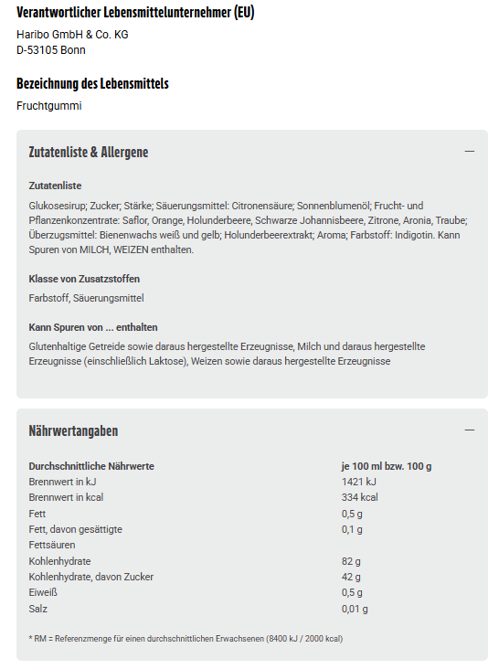 Glukosesirup; Zucker; Stärke; Säuerungsmittel: Citronensäure; Sonnenblumenöl; Frucht- und Pflanzenkonzentrate: Saflor, Orange, Holunderbeere, Schwarze Johannisbeere, Zitrone, Aronia, Traube; Überzugsmittel: Bienenwachs weiß und gelb; Holunderbeerextrakt; Aroma; Farbstoff: Indigotin. Kann Spuren von MILCH, WEIZEN enthalten.
