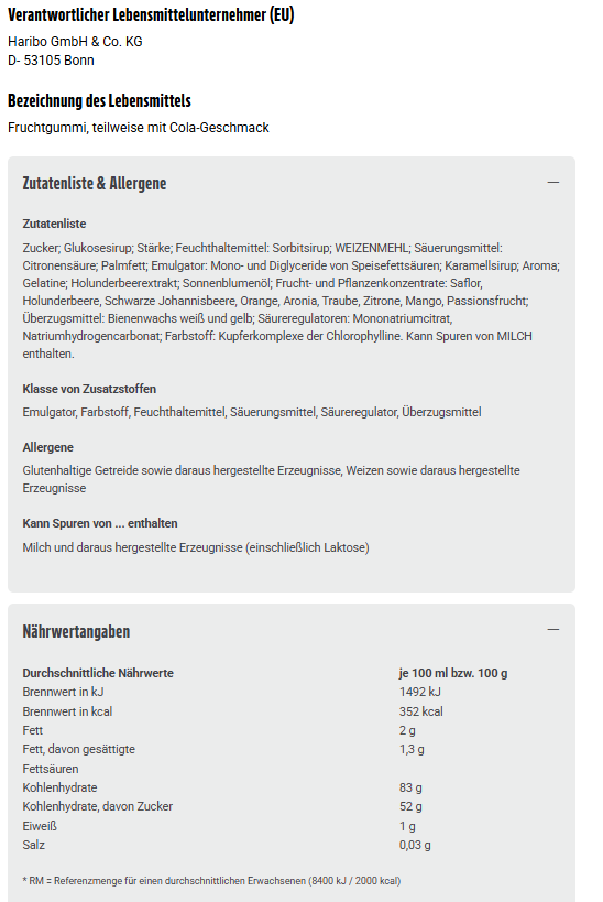 Zucker; Glukosesirup; Stärke; Feuchthaltemittel: Sorbitsirup; WEIZENMEHL; Säuerungsmittel: Citronensäure; Palmfett; Emulgator: Mono- und Diglyceride von Speisefettsäuren; Karamellsirup; Aroma; Gelatine; Holunderbeerextrakt; Sonnenblumenöl; Frucht- und Pflanzenkonzentrate: Saflor, Holunderbeere, Schwarze Johannisbeere, Orange, Aronia, Traube, Zitrone, Mango, Passionsfrucht; Überzugsmittel: Bienenwachs weiß und gelb; Säureregulatoren: Mononatriumcitrat, Natriumhydrogencarbonat; Farbstoff: Kupferkomplexe der Chlorophylline. Kann Spuren von MILCH enthalten.