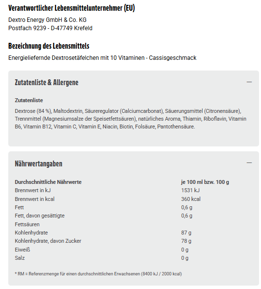 Dextrose (84 %), Maltodextrin, Säureregulator (Calciumcarbonat), Säuerungsmittel (Citronensäure), Trennmittel (Magnesiumsalze der Speisetfettsäuren), natürliches Aroma, Thiamin, Riboflavin, Vitamin B6, Vitamin B12, Vitamin C, Vitamin E, Niacin, Biotin, Folsäure, Pantothensäure.