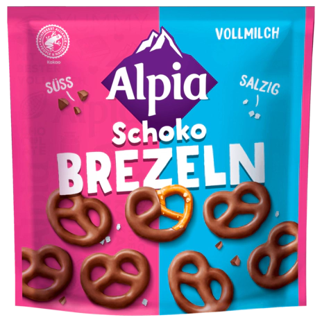 Zutaten: gesalzenes Laugengebäck (WEIZENmehl (GLUTEN), Rapsöl, Salz, Hefe, WEIZENmalzmehl (GLUTEN), Backtriebmittel: Natriumcarbonate, Säureregulator: Natriumhydroxid), Zucker, Kakaobutter*, VollMILCHpulver, Kakaomasse*, MILCHzucker, Süßmolkenpulver (MILCH), MagerMILCHpulver, Emulgator: Lecithine (SOJA), E476; Salz, natürliches Vanille-Aroma. * Rainforest Alliance-zertifiziert.