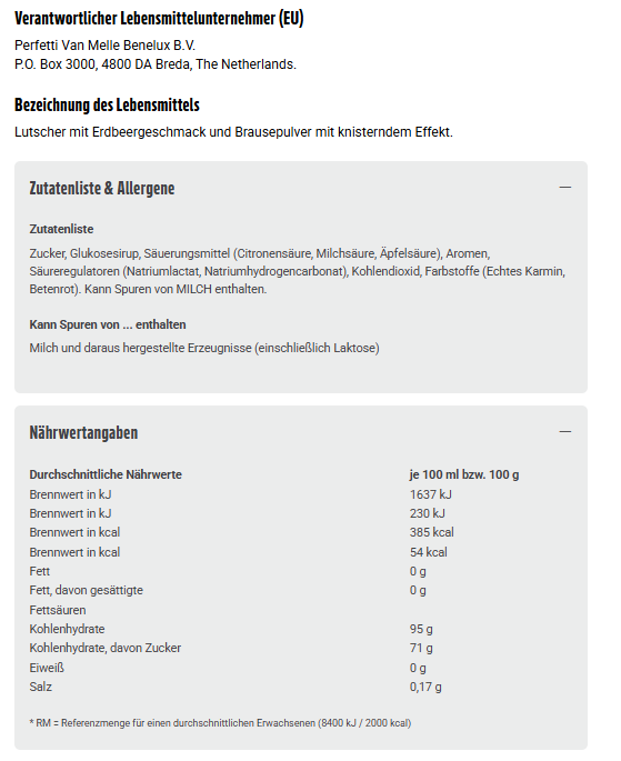 Zucker, Glukosesirup, Säuerungsmittel (Citronensäure, Milchsäure, Äpfelsäure), Aromen, Säureregulatoren (Natriumlactat, Natriumhydrogencarbonat), Kohlendioxid, Farbstoffe (Echtes Karmin, Betenrot). Kann Spuren von MILCH enthalten.