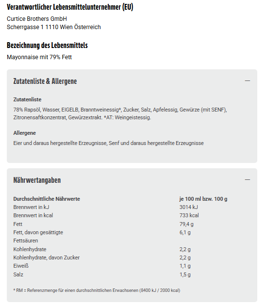 78% Rapsöl, Wasser, EIGELB, Branntweinessig*, Zucker, Salz, Apfelessig, Gewürze (mit SENF), Zitronensaftkonzentrat, Gewürzextrakt. *AT: Weingeistessig.