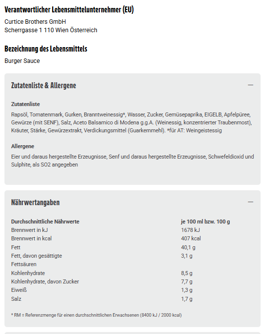 Rapsöl, Tomatenmark, Gurken, Branntweinessig*, Wasser, Zucker, Gemüsepaprika, EIGELB, Apfelpüree, Gewürze (mit SENF), Salz, Aceto Balsamico di Modena g.g.A. (Weinessig, konzentrierter Traubenmost), Kräuter, Stärke, Gewürzextrakt, Verdickungsmittel (Guarkernmehl). *für AT: Weingeistessig