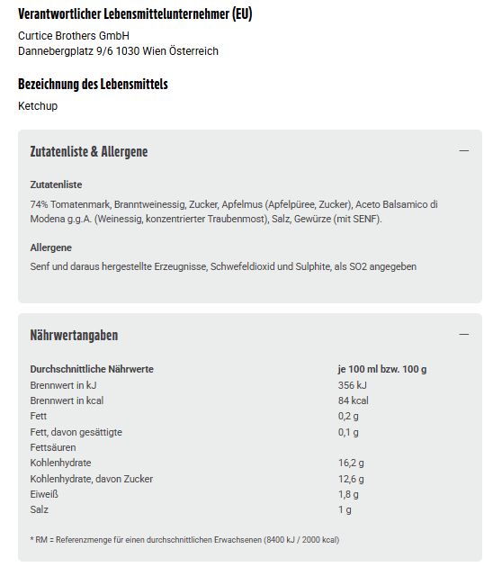 74% Tomatenmark, Branntweinessig, Zucker, Apfelmus (Apfelpüree, Zucker), Aceto Balsamico di Modena g.g.A. (Weinessig, konzentrierter Traubenmost), Salz, Gewürze (mit SENF).