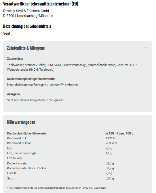 Trinkwasser, brauner Zucker, SENFSAAT, Branntweinessig¹, Karamellzuckersirup, Gewürze. (¹AT: Weingeistessig, für CH: Tafelessig)