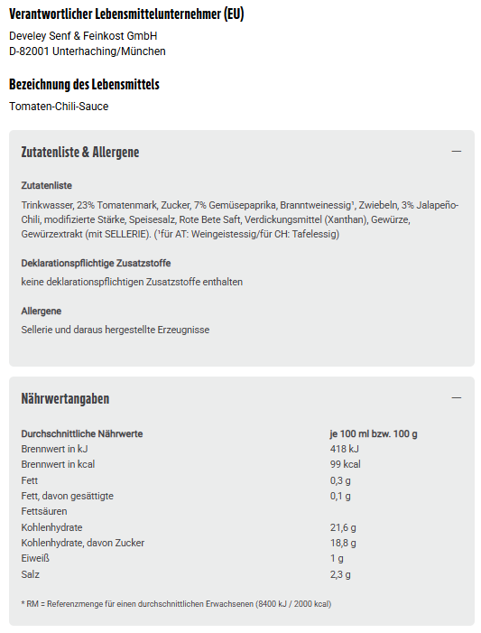 Trinkwasser, 23% Tomatenmark, Zucker, 7% Gemüsepaprika, Branntweinessig¹, Zwiebeln, 3% Jalapeño-Chili, modifizierte Stärke, Speisesalz, Rote Bete Saft, Verdickungsmittel (Xanthan), Gewürze, Gewürzextrakt (mit SELLERIE). (¹für AT: Weingeistessig/für CH: Tafelessig)