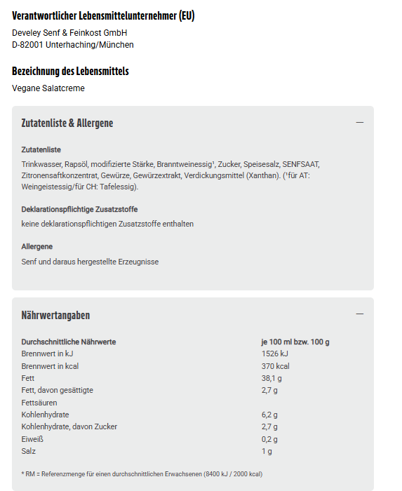 Trinkwasser, Rapsöl, modifizierte Stärke, Branntweinessig¹, Zucker, Speisesalz, SENFSAAT, Zitronensaftkonzentrat, Gewürze, Gewürzextrakt, Verdickungsmittel (Xanthan). (¹für AT: Weingeistessig/für CH: Tafelessig).