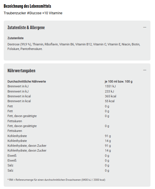 Dextrose (99,9 %), Thiamin, Riboflavin, Vitamin B6, Vitamin B12, Vitamin C, Vitamin E, Niacin, Biotin, Folsäure, Pantothensäure.