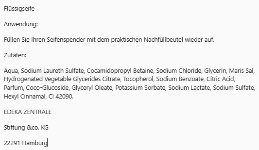 Aqua, Sodium Laureth Sulfate, Cocamidopropyl Betaine, Sodium Chloride, Glycerin, Maris Sal, Hydrogenated Vegetable Glycerides Citrate, Tocopherol, Sodium Benzoate, Citric Acid, Parfum, Coco-Glucoside, Glyceryl Oleate, Potassium Sorbate, Sodium Lactate, Sodium Sulfate, Hexyl Cinnamal, CI 42090.