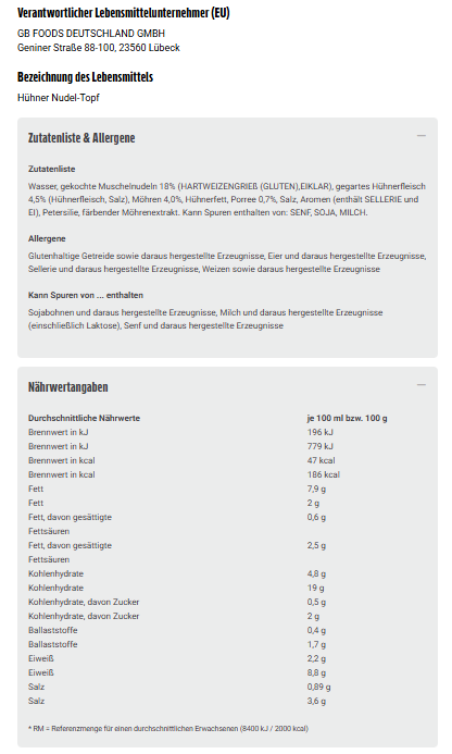 Wasser, gekochte Muschelnudeln 18% (HARTWEIZENGRIEß (GLUTEN),EIKLAR), gegartes Hühnerfleisch 4,5% (Hühnerfleisch, Salz), Möhren 4,0%, Hühnerfett, Porree 0,7%, Salz, Aromen (enthält SELLERIE und EI), Petersilie, färbender Möhrenextrakt. Kann Spuren enthalten von: SENF, SOJA, MILCH.
