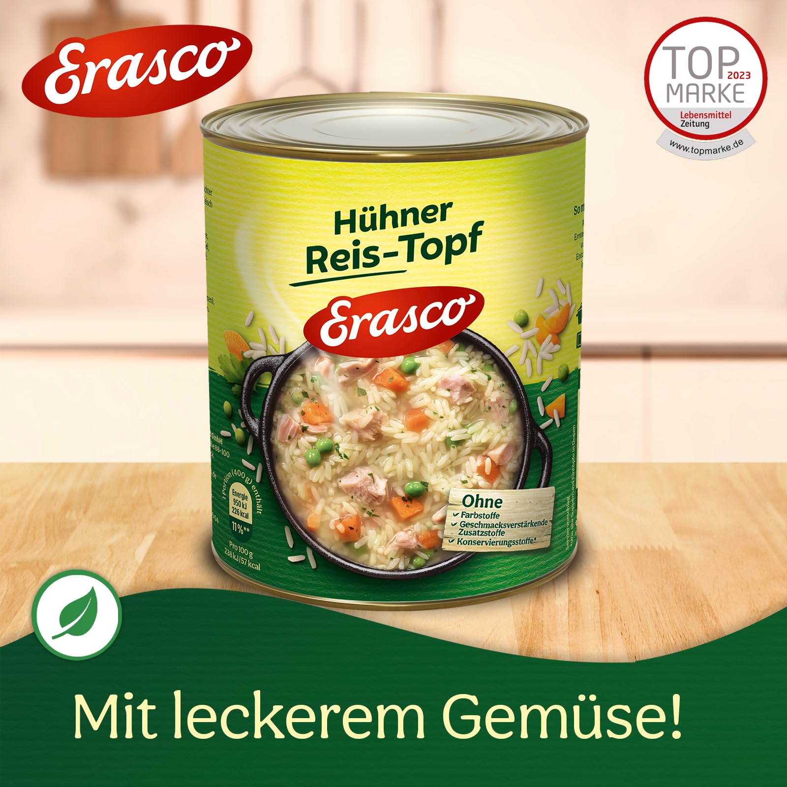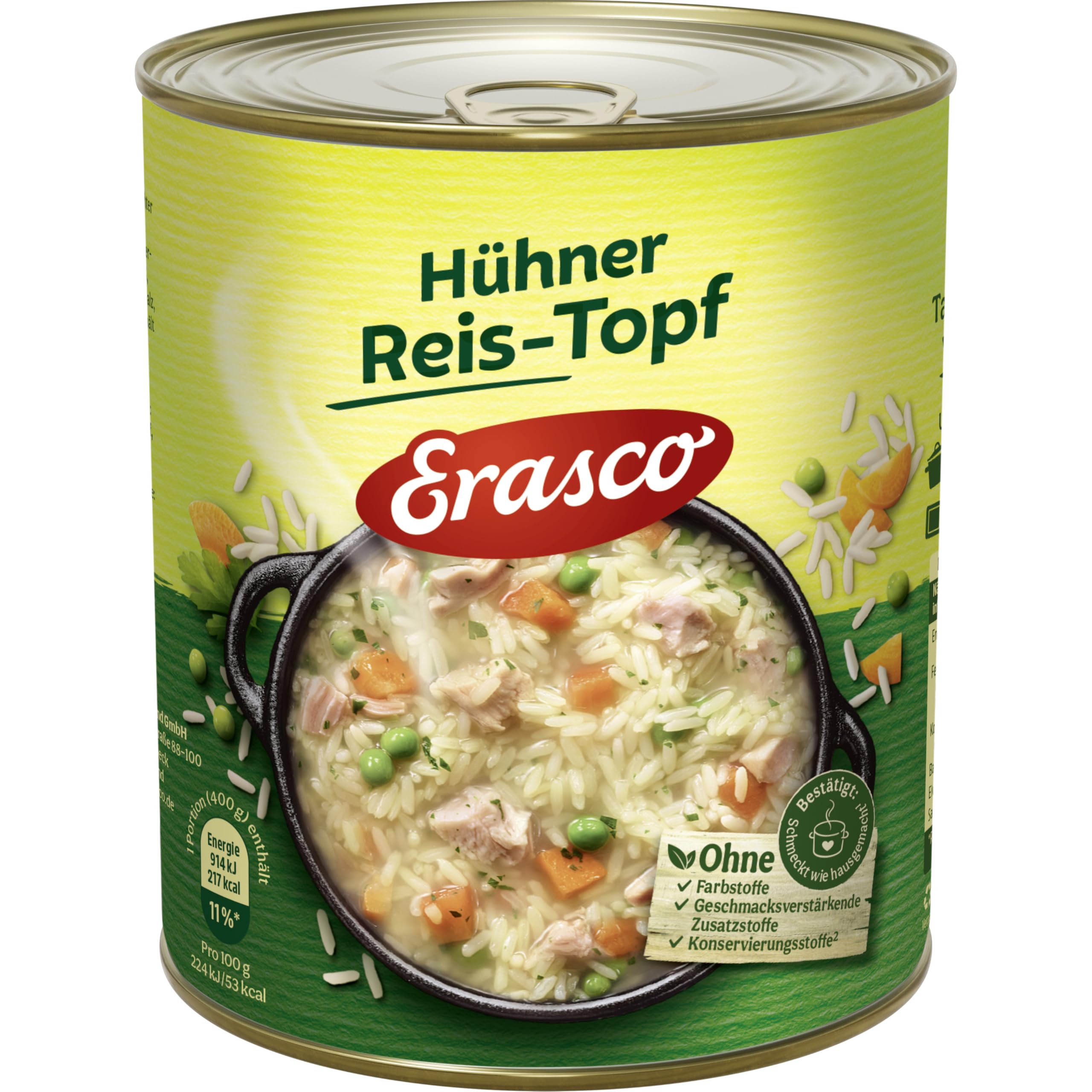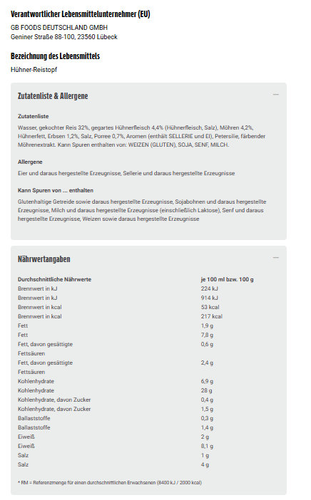 Wasser, gekochter Reis 32%, gegartes Hühnerfleisch 4,4% (Hühnerfleisch, Salz), Möhren 4,2%, Hühnerfett, Erbsen 1,2%, Salz, Porree 0,7%, Aromen (enthält SELLERIE und EI), Petersilie, färbender Möhrenextrakt. Kann Spuren enthalten von: WEIZEN (GLUTEN), SOJA, SENF, MILCH.