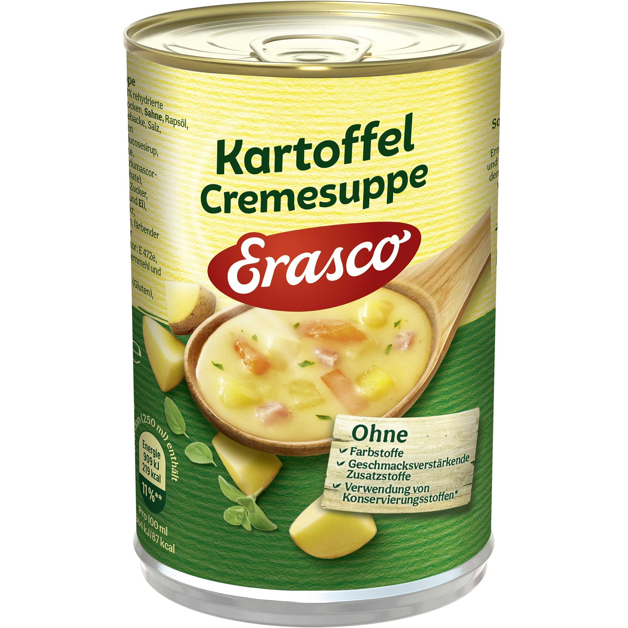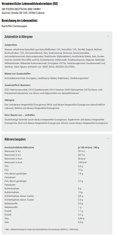 Wasser, rehydrierte Kartoffeln aus Kartoffelflocken 13%, Kartoffeln 12%, SAHNE, Rapsöl, Möhren, Kochschinken 1,5%, (Schweinefleisch, Salz, Glukosesirup, Dextrose, Gewürzextrakte, Antioxidationsmittel: Natriumascorbat, Stabilisator: Diphosphate), modifizierte Stärke, Salz, Zucker, Aromen (enthält SELLERIE und EI), Zwiebelpulver, Hefeextrakt, Knoblauchpulver, Majoran, färbender Möhrenextrakt, färbender Kurkumaextrakt, Emulgator: E472e, Verdickungsmittel: Guarkernmehl und Xanthan. Kann Spuren enthalten von: SENF, SOJA, WEIZEN (GLUTEN).
