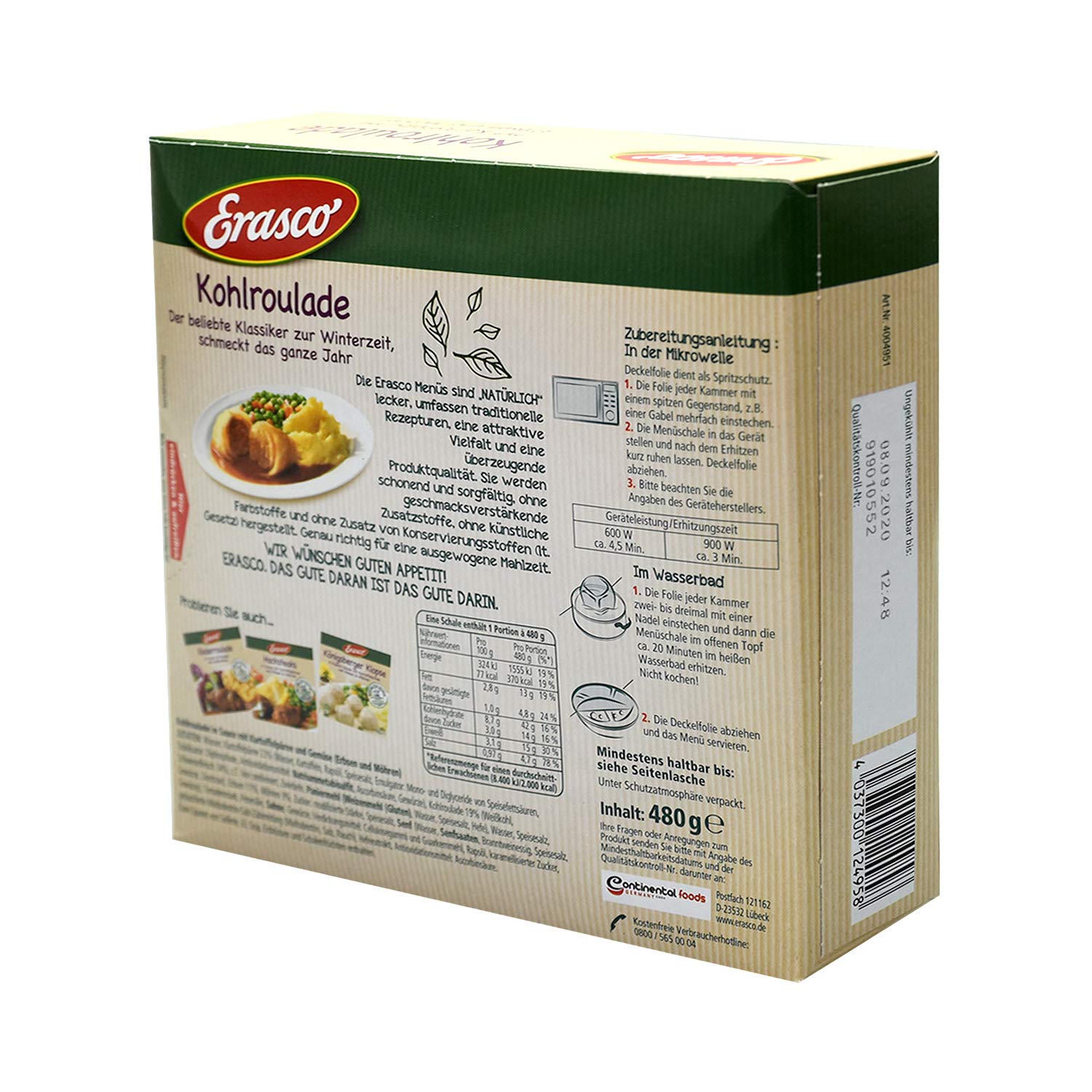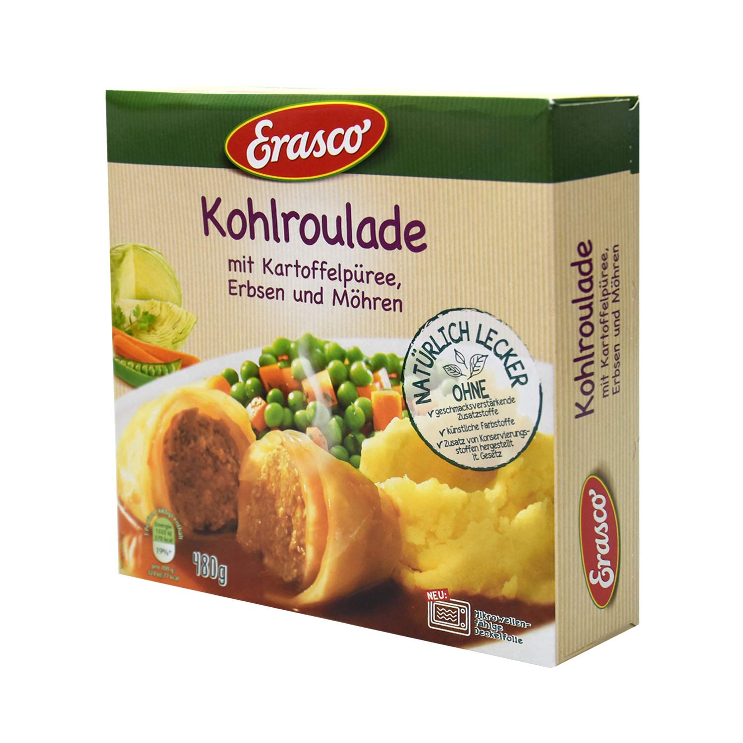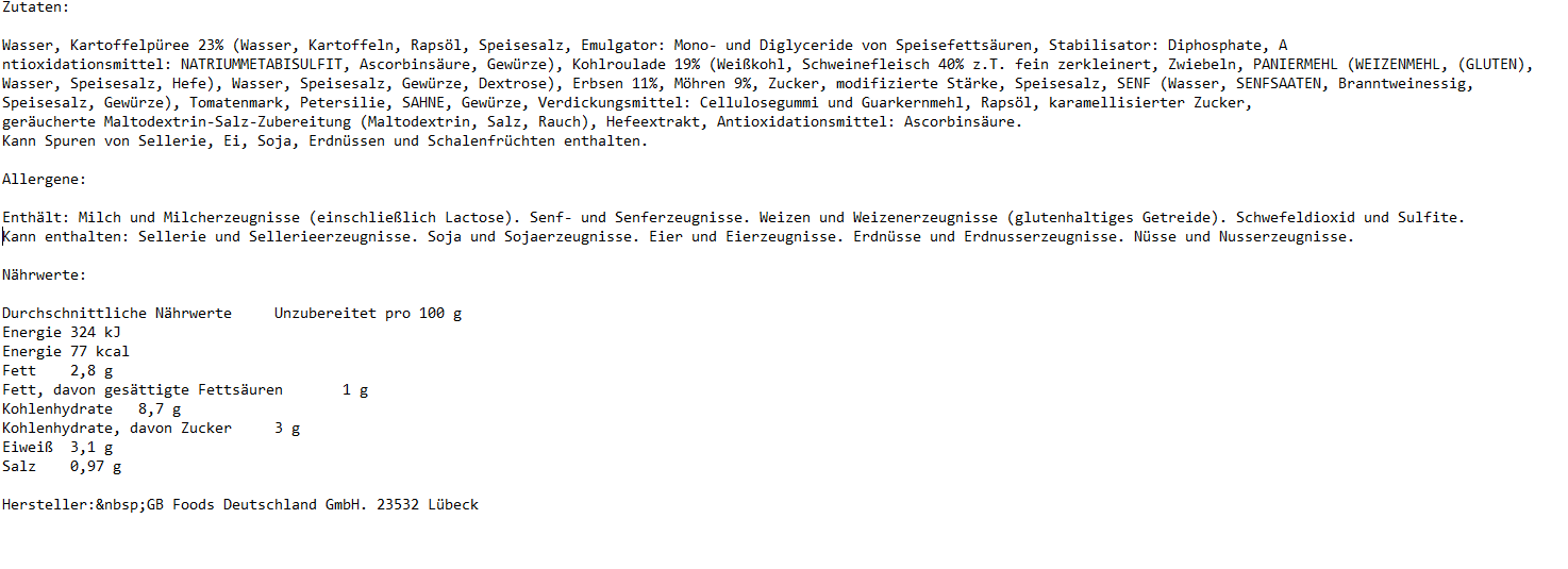 Wasser, Kartoffelpüree 23% (Wasser, Kartoffeln, Rapsöl, Speisesalz, Emulgator: Mono- und Diglyceride von Speisefettsäuren, Stabilisator: Diphosphate, Antioxidationsmittel: NATRIUMMETABISULFIT, Ascorbinsäure, Gewürze), Kohlroulade 19% (Weißkohl, Schweinefleisch 40% z.T. fein zerkleinert, Zwiebeln, PANIERMEHL (WEIZENMEHL, (GLUTEN), Wasser, Speisesalz, Hefe), Wasser, Speisesalz, Gewürze, Dextrose), Erbsen 11%, Möhren 9%, Zucker, modifizierte Stärke, Speisesalz, SENF (Wasser, SENFSAATEN, Branntweinessig, Speisesalz, Gewürze), Tomatenmark, Petersilie, SAHNE, Gewürze, Verdickungsmittel: Cellulosegummi und Guarkernmehl, Rapsöl, karamellisierter Zucker, geräucherte Maltodextrin-Salz-Zubereitung (Maltodextrin, Salz, Rauch), Hefeextrakt, Antioxidationsmittel: Ascorbinsäure. Kann Spuren von Sellerie, Ei, Soja, Erdnüssen und Schalenfrüchten enthalten.