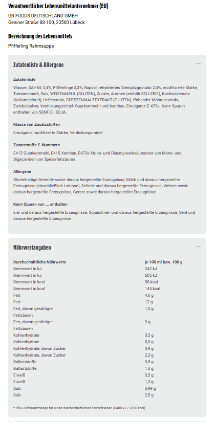Wasser, SAHNE 3,4%, Pfifferlinge 3,3%, Rapsöl, rehydriertes Steinpilzgranulat 2,4%, modifizierte Stärke, Tomatenmark, Salz, WEIZENMEHL (GLUTEN), Zucker, Aromen (enthält SELLERIE), Kochsalzersatz (Kaliumchlorid), Hefeextrakt, GERSTENMALZEXTRAKT (GLUTEN), färbender Möhrenextrakt, Zwiebelpulver, Verdickungsmittel: Guarkernmehl und Xanthan, Emulgator: E 472e. Kann Spuren enthalten von SENF, EI, SOJA.