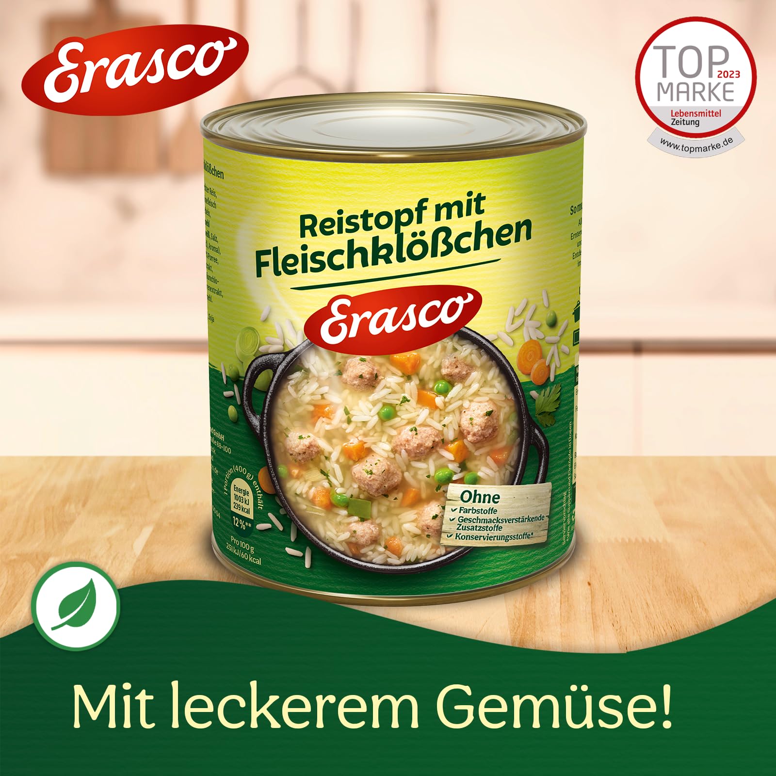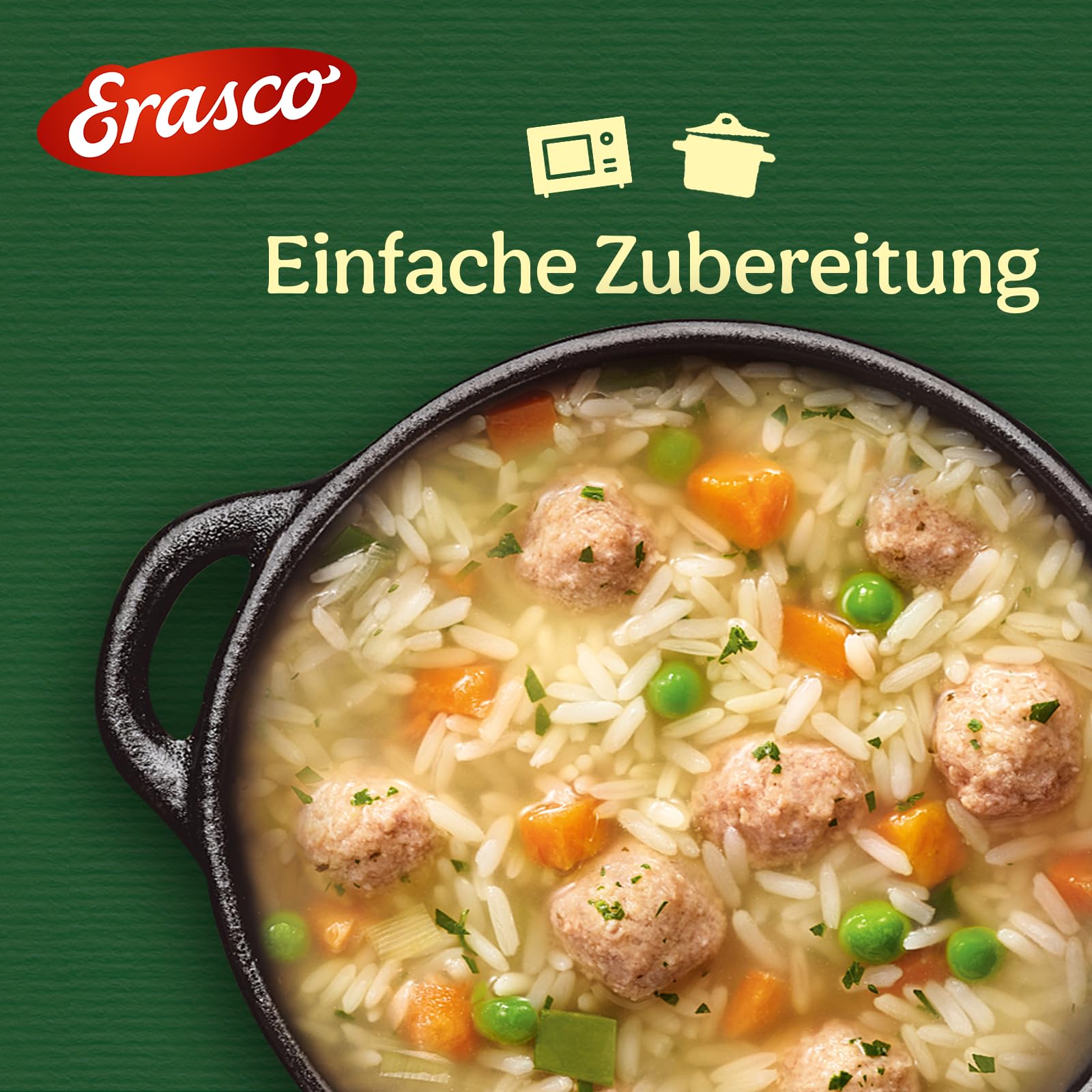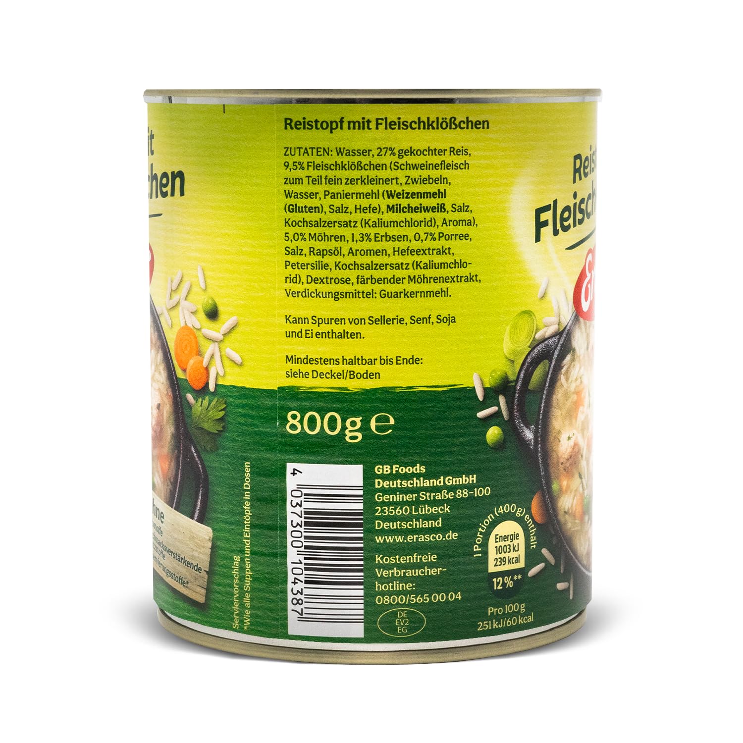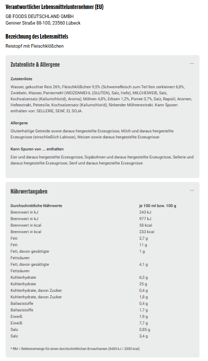 Wasser, gekochter Reis 26%, Fleischklößchen 9,5% (Schweinefleisch zum Teil fein zerkleinert 6,8%, Zwiebeln, Wasser, Paniermehl (WEIZENMEHL (GLUTEN), Salz, Hefe), MILCHEIWEIß, Salz, Kochsalzersatz (Kaliumchlorid), Aroma), Möhren 4,8%, Erbsen 1,2%, Porree 0,7%, Salz, Rapsöl, Aromen, Hefeextrakt, Petersilie, Kochsalzersatz (Kaliumchlorid), färbender Möhrenextrakt. Kann Spuren enthalten von: SELLERIE, SENF, EI, SOJA.