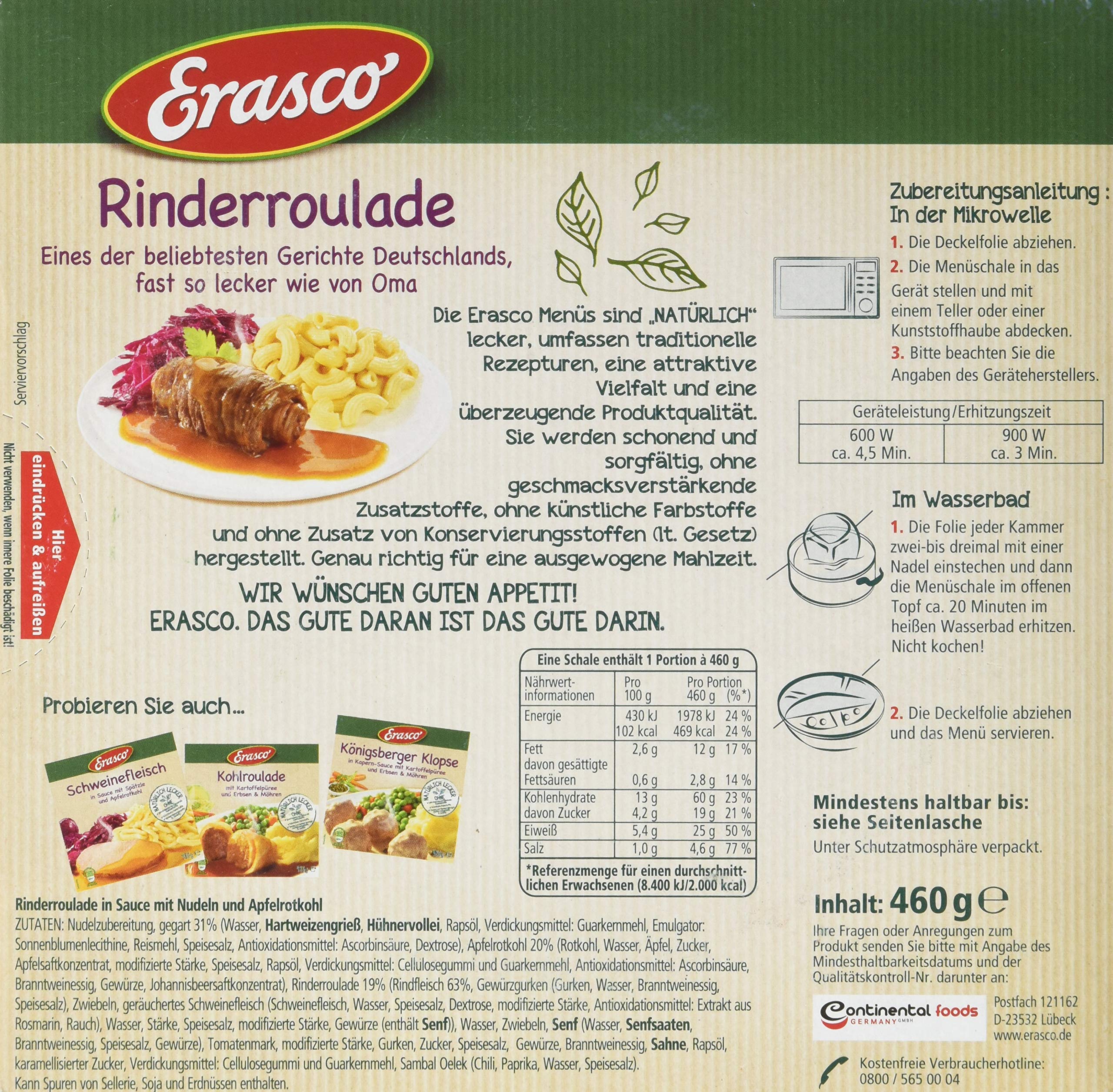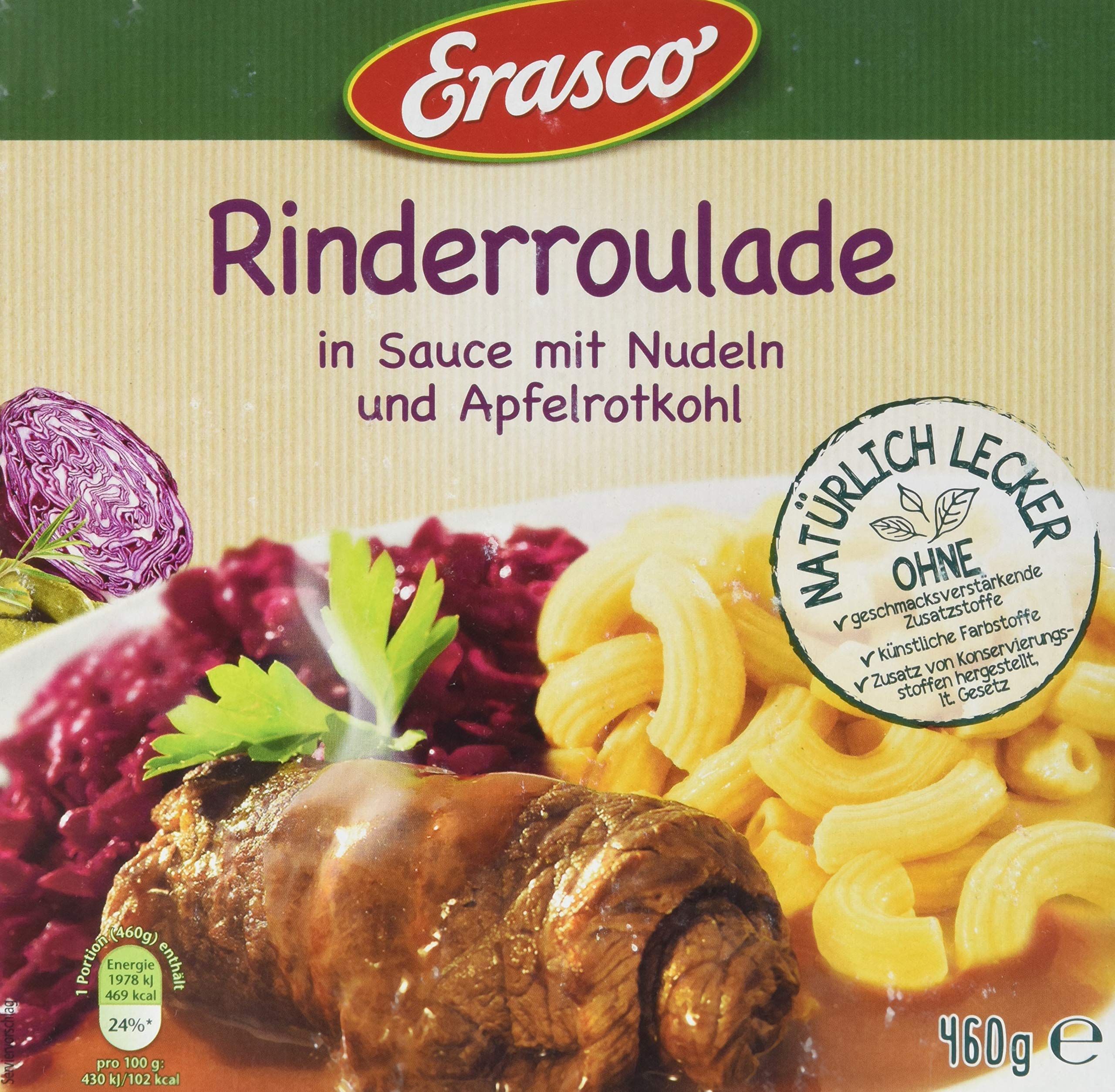 Gegarte Nudelzubereitung 31% (Wasser, HARTWEIZENGRIEß (GLUTEN), VOLLEI, Rapsöl, Verdickungsmittel: Guarkernmehl, Emulgator: Lecithine, Salz, Antioxidationsmittel: Ascorbinsäure und Natriumascorbat), Apfelrotkohlzubereitung 20% (Rotkohl 14,5%, Wasser, Äpfel 1,4%, Zucker, Apfelsaftkonzentrat, modifizierte Stärke, Salz, Rapsöl, Verdickungsmittel: Guarkernmehl, Antioxidationsmittel: Ascorbinsäure, Branntweinessig, Gewürze, Johannisbeersaftkonzentrat, Säuerungsmittel: Citronensäure), Rinderroulade 19% (Rindfleisch 10,5%, Füllung 8,5% (Schweinefleisch 2,2%, Gewürzgurken (Gurken, Wasser, Branntweinessig, Salz), Zwiebeln, Paniermehl (WEIZENMEHL (GLUTEN), Wasser, Salz, Hefe), SENF (Wasser, SENFSAATEN, Salz, Zucker, Branntweinessig, Gewürze), Wasser, Gewürze, Salz, Stärke)), Wasser, Zwiebeln, SENF (Wasser, SENFSAATEN, Branntweinessig, Salz, Gewürze), Tomatenmark, modifizierte Stärke, Gurken, Zucker, Salz, Gewürze, Branntweinessig, SAHNE, Rapsöl, karamellisierter Zucker, Verdickungsmittel: Guarkernmehl, Sambal Oelek (Chili, Paprika, Wasser, Salz). Kann Spuren enthalten von: SELLERIE, SOJA, ERDNÜSSE, SCHALENFRÜCHTE.
