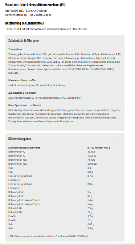 Wasser, gekochte rote Bohnen 23%, gekochte weiße Bohnen 9,4%, Zwiebeln, Möhren, Fleischwurst 3,9% (Schweinefleisch, Wasser, Salz, Gewürze, Dextrose, Glukosesirup, Stabilisatoren: Diphosphate und Natriumnitrit, Antioxidationsmittel: E300 und E316), grüne Bohnen, Mais 0,9%, modifizierte Stärke, Salz, Zucker, Rapsöl, Tomatenmark, Hefeextrakt, schwarzer Pfeffer, färbender Paprikaextrakt, Knoblauchpulver, Aromen. Kann Spuren enthalten von: SOJA, SENF, MILCH, EI, WEIZEN (GLUTEN), SELLERIE.