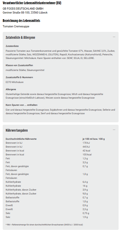 Passierte Tomaten aus Tomatenkonzentrat und gewürfelte Tomaten 67%, Wasser, SAHNE 3,5%, Zucker, modifizierte Stärke, Salz, WEIZENMEHL (GLUTEN), Rapsöl, Kochsalzersatz (Kaliumchlorid), Petersilie, Säuerungsmittel: Milchsäure. Kann Spuren enthalten von: SENF, SOJA, EI, SELLERIE.