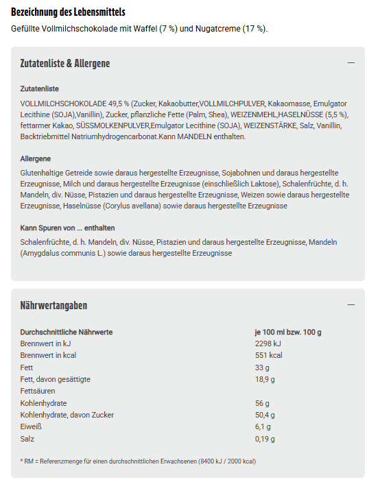 Gefüllte Vollmilchschokolade mit Waffel (7 %) und Nugatcreme (17 %).