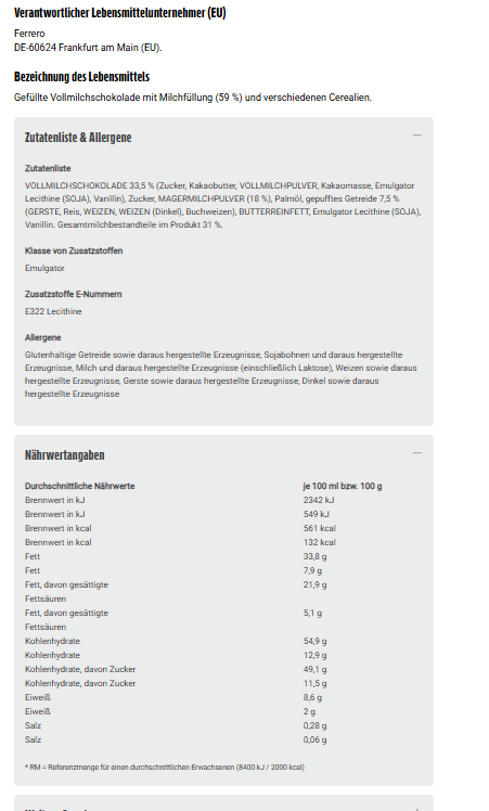 Zutaten: VOLLMILCHSCHOKOLADE 33,5 % (Zucker, Kakaobutter, VOLLMILCHPULVER, Kakaomasse, Emulgator Lecithine (SOJA), Vanillin), Zucker, MAGERMILCHPULVER (18 %), Palmöl, gepufftes Getreide 7,5 % (GERSTE, Reis, WEIZEN, WEIZEN (Dinkel), Buchweizen), BUTTERREINFETT, Emulgator Lecithine (SOJA), Vanillin. Gesamtmilchbestandteile im Produkt 31 %.