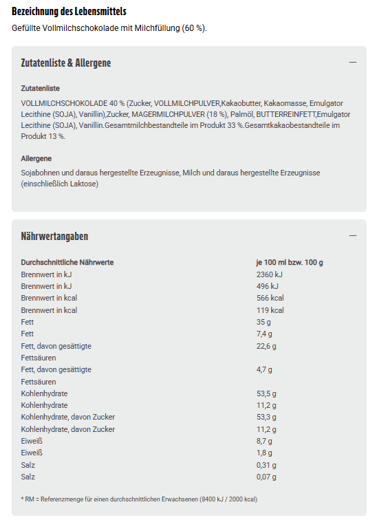 VOLLMILCHSCHOKOLADE 40 % (Zucker, VOLLMILCHPULVER,Kakaobutter, Kakaomasse, Emulgator Lecithine (SOJA), Vanillin),Zucker, MAGERMILCHPULVER (18 %), Palmöl, BUTTERREINFETT,Emulgator Lecithine (SOJA), Vanillin.Gesamtmilchbestandteile im Produkt 33 %.Gesamtkakaobestandteile im Produkt 13 %.