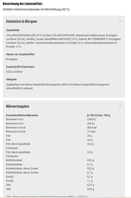 Zutaten: VOLLMILCHSCHOKOLADE 40 % (Zucker, VOLLMILCHPULVER, Kakaobutter, Kakaomasse, Emulgator Lecithine (SOJA), Vanillin), Zucker, MAGERMILCHPULVER (18 %), Palmöl, BUTTERREINFETT, Emulgator Lecithine (SOJA), Vanillin. Gesamtmilchbestandteile im Produkt 33 %. Gesamtkakaobestandteile im Produkt 13 %.