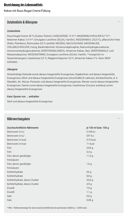 Nuss-Nugat-Creme 40 % (Zucker, Palmöl, HASELNÜSSE 13 %**, MAGERMILCHPULVER 8,7 %**, fettarmer Kakao 7,4 %**, Emulgator Lecithine (SOJA), Vanillin), WEIZENMEHL (32,5 %), pflanzliche Fette (Palm, Palmkern), Rohrzucker 8,5 % (enthält WEIZEN), MILCHZUCKER, WEIZENKLEIE, VOLLMILCHPULVER, Honig, Backtriebmittel: Dinatriumdiphosphat, Natriumhydrogencarbonat, Ammoniumhydrogencarbonat; GERSTENMALZMEHL, fettarmer Kakao, Salz, GERSTENMALZ- und Maisextraktpulver, WEIZENSTÄRKE, Emulgator Lecithine (SOJA), Vanillin. **entspricht im Gesamterzeugnis: Haselnüsse 5,2 %, Magermilchpulver 3,5 %, fettarmer Kakao 3 %. Kann SENF enthalten.
