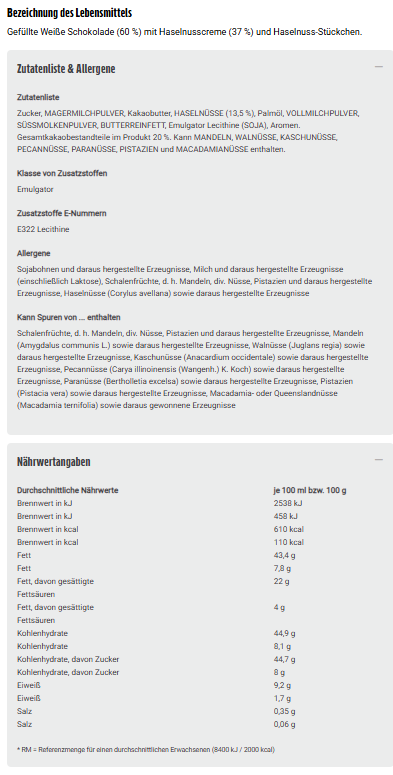 Gefüllte Weiße Schokolade (60 %) mit Haselnusscreme (37 %) und Haselnuss-Stückchen.
