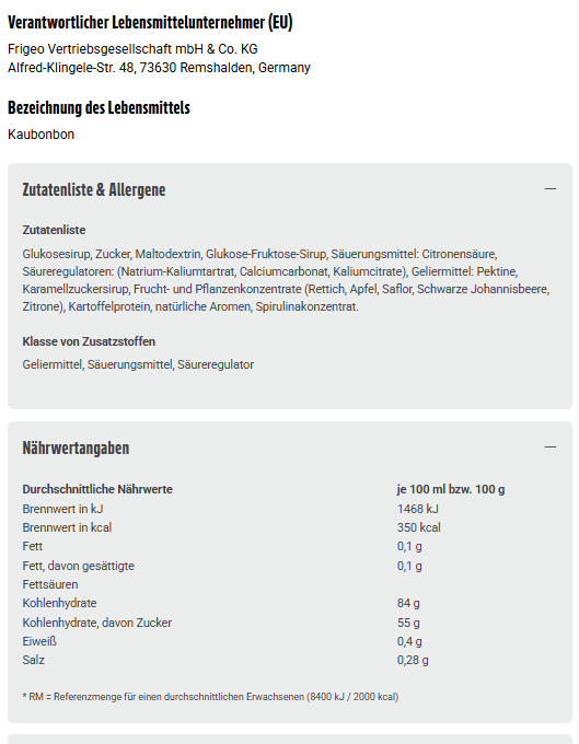 Glukosesirup, Zucker, Maltodextrin, Glukose-Fruktose-Sirup, Säuerungsmittel: Citronensäure, Säureregulatoren: (Natrium-Kaliumtartrat, Calciumcarbonat, Kaliumcitrate), Geliermittel: Pektine, Karamellzuckersirup, Frucht- und Pflanzenkonzentrate (Rettich, Apfel, Saflor, Schwarze Johannisbeere, Zitrone), Kartoffelprotein, natürliche Aromen, Spirulinakonzentrat.