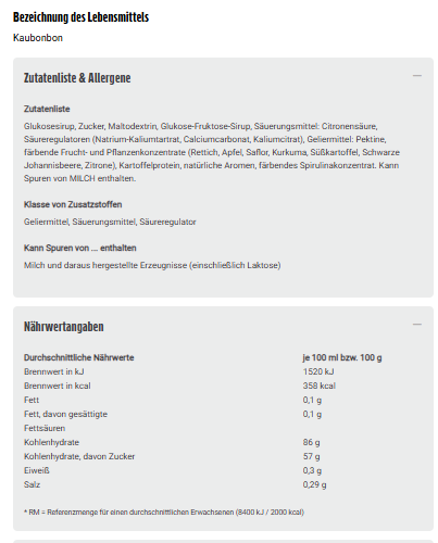 Glukosesirup, Zucker, Maltodextrin, Glukose-Fruktose-Sirup, Säuerungsmittel: Citronensäure, Säureregulatoren (Natrium-Kaliumtartrat, Calciumcarbonat, Kaliumcitrat), Geliermittel: Pektine, färbende Frucht- und Pflanzenkonzentrate (Rettich, Apfel, Saflor, Kurkuma, Süßkartoffel, Schwarze Johannisbeere, Zitrone), Kartoffelprotein, natürliche Aromen, färbendes Spirulinakonzentrat. Kann Spuren von MILCH enthalten.