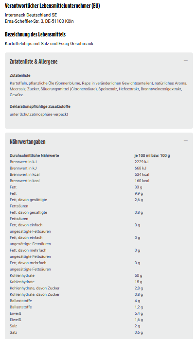 Zutaten: Kartoffeln, pflanzliche Öle (Sonnenblume, Raps in veränderlichen Gewichtsanteilen), natürliches Aroma, Meersalz, Zucker, Säuerungsmittel (Citronensäure), Speisesalz, Hefeextrakt, Branntweinessigextrakt, Gewürz.
