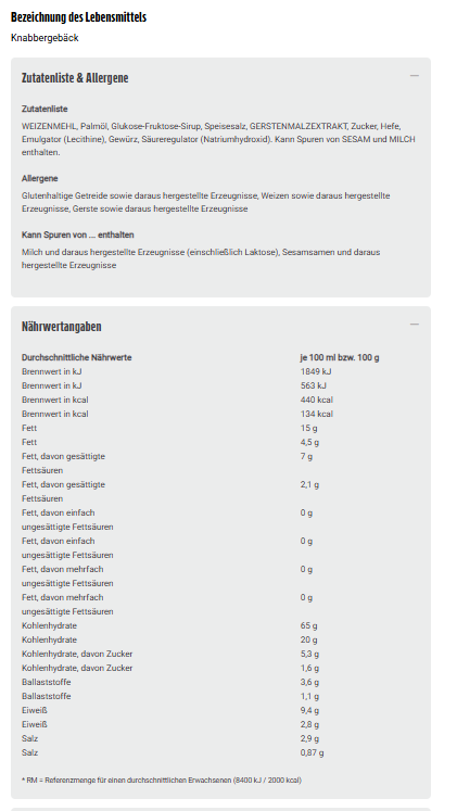 Zutaten: WEIZENMEHL, Palmöl, Glukose-Fruktose-Sirup, Speisesalz, GERSTENMALZEXTRAKT, Zucker, Hefe, Emulgator (Lecithine), Gewürz, Säureregulator (Natriumhydroxid). Kann Spuren von SESAM und MILCH enthalten.