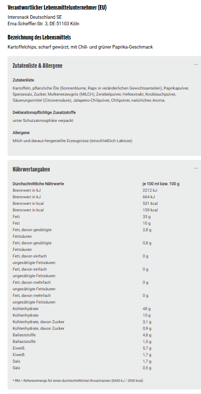 Kartoffeln, pflanzliche Öle (Sonnenblume, Raps in veränderlichen Gewichtsanteilen), Paprikapulver, Speisesalz, Zucker, Molkenerzeugnis (MILCH), Zwiebelpulver, Hefeextrakt, Knoblauchpulver, Säuerungsmittel (Citronensäure), Jalapeno-Chilipulver, Chilipulver, natürliches Aroma.