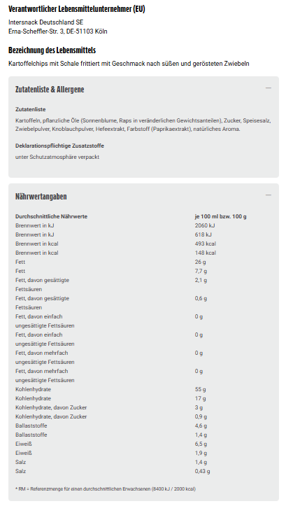 Kartoffeln, pflanzliche Öle (Sonnenblume, Raps in veränderlichen Gewichtsanteilen), Zucker, Speisesalz, Zwiebelpulver, Knoblauchpulver, Hefeextrakt, Farbstoff (Paprikaextrakt), natürliches Aroma.